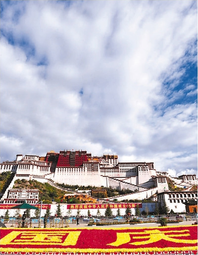 拉萨布达拉宫广场上张灯结彩,节日气氛浓厚,庆祝中华人民共和国成立65周年。