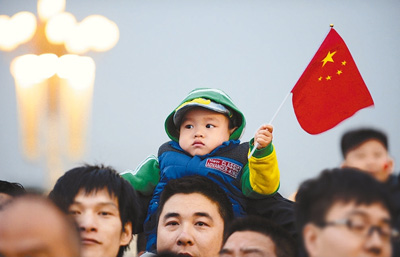 10月1日清晨,来自全国各地的约12万名群众在北京天安门广场观看升国旗仪式,庆祝中华人民共和国成立65周年。图为一名小朋友在天安门广场等待升国旗仪式开始。