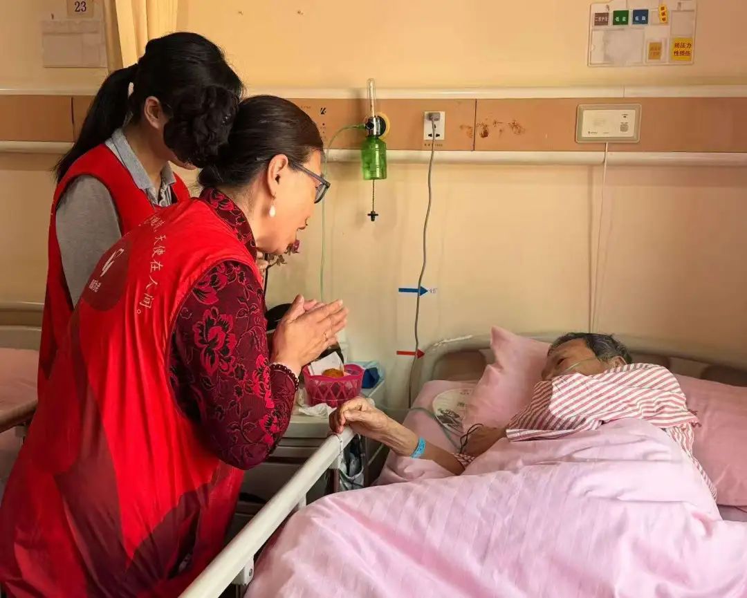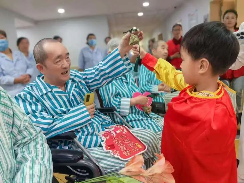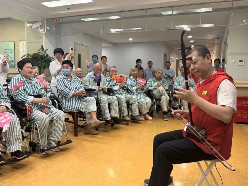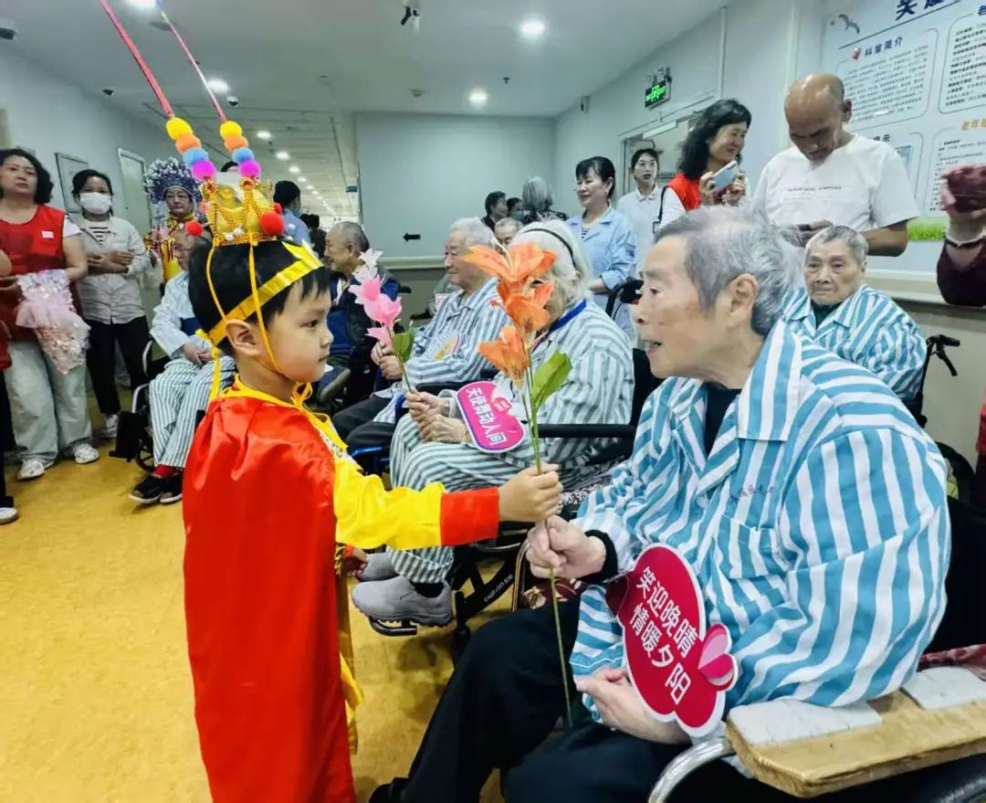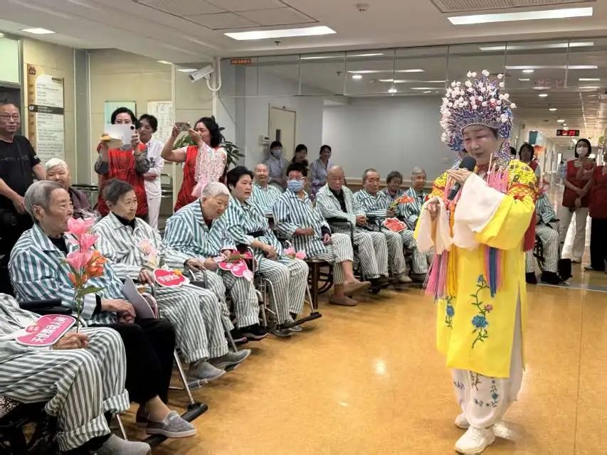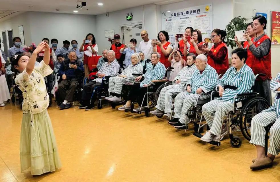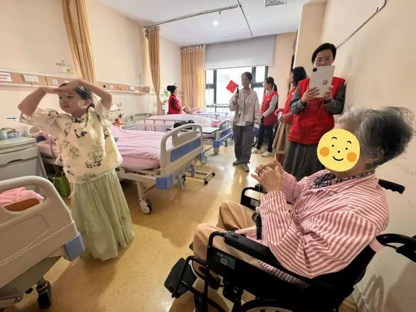 鉴于部分长者无法亲临现场,志愿者们特地深入安宁疗护病房。一位年仅五岁的小志愿者在病房内表演了精心编排的“袖珍版”《中国功夫》,动作特意放缓以适应长者们的步调。八旬高龄的陈老先生虽卧病在床,仍竭力举起手来,与小志愿者一同比画着武术招式。此外,志愿者们还为长者们准备了他们钟爱的越剧表演,长者们伴随着曲调轻声吟唱。