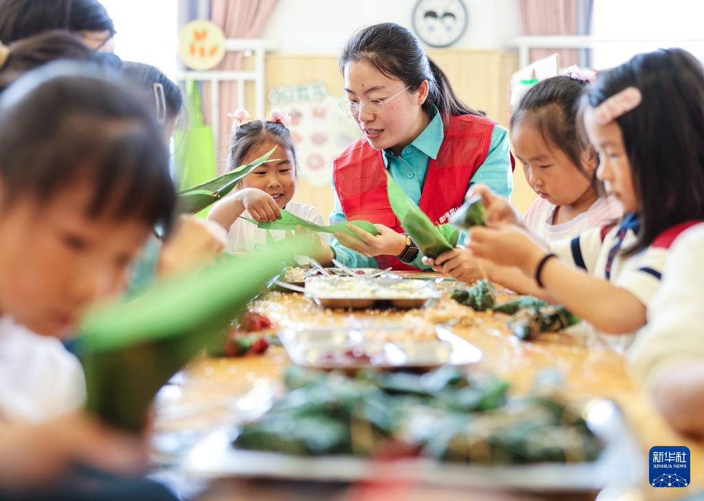5月28日,在山东省荣成市第二实验幼儿园,志愿者与孩子们一起制作粽子。