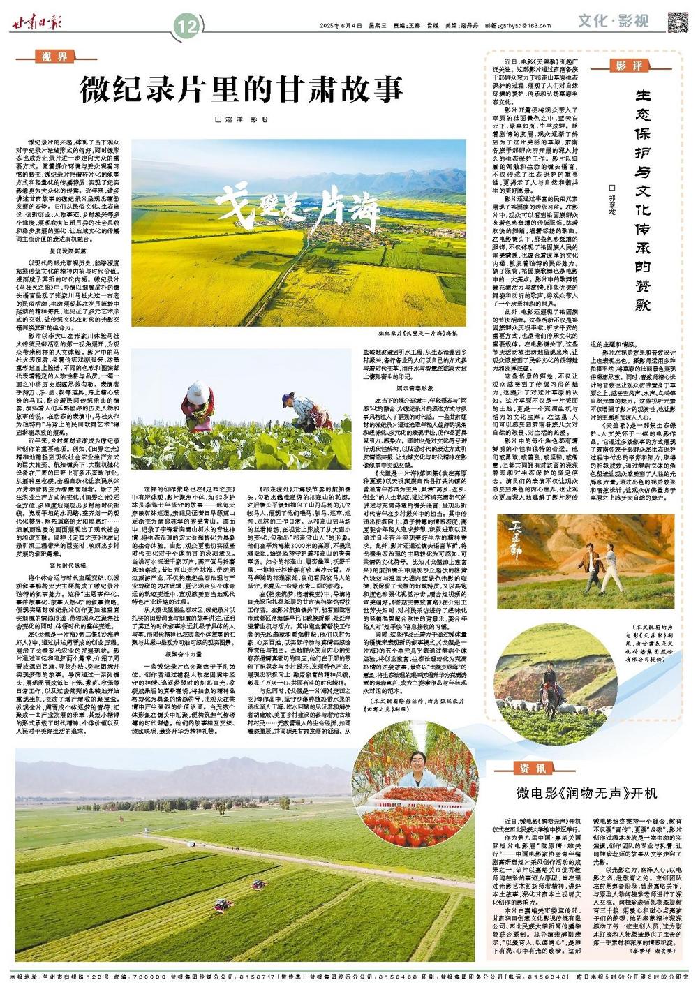 微纪录片的兴起,体现了当下观众对于纪录片浓缩形式的偏好,同时微形态也成为纪录片进一步走向大众的重要方式。随着媒介环境与受众观看习惯的转变,微纪录片凭借碎片化的叙事方式和轻量化的传播特质,实现了纪实影像更为大众化的传播。近年来,诸多讲述甘肃故事的微纪录片呈现出蓬勃发展的态势。它们从民俗文化、生态建设、创新创业、人物事迹、乡村振兴等多个维度,展现我省日新月异的社会风貌和稳步发展的变化,让地域文化的传播同主流价值的表达有机融合。