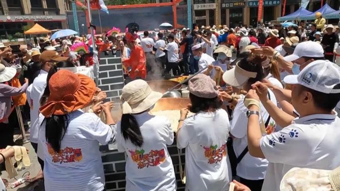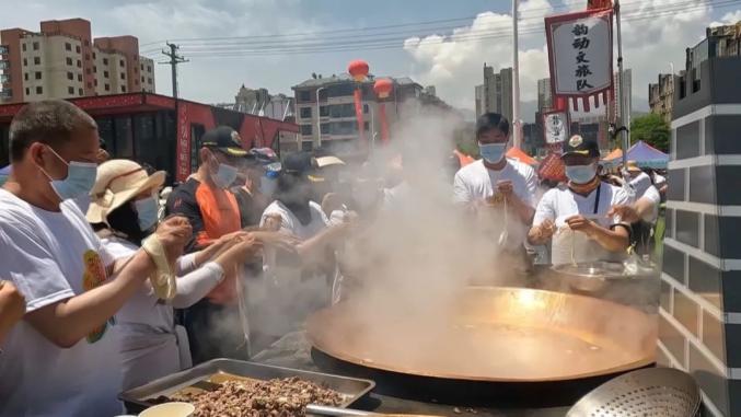 活动现场,6口直径1.2米的大铜锅架设在仿长城烽火台造型的灶台上,成为亮眼地标。厨艺高手们施展精湛技艺,揉面、切面、揪片、烹煮一气呵成,热腾腾的面片搭配鲜香浓郁的臊子,勾起观众味蕾记忆。与此同时,民族舞蹈《河湟情韵》灵动飘逸,“花儿”演唱高亢嘹亮,文艺表演与美食体验交相辉映,让现场千余名观众沉浸式感受河湟文化的多元魅力。