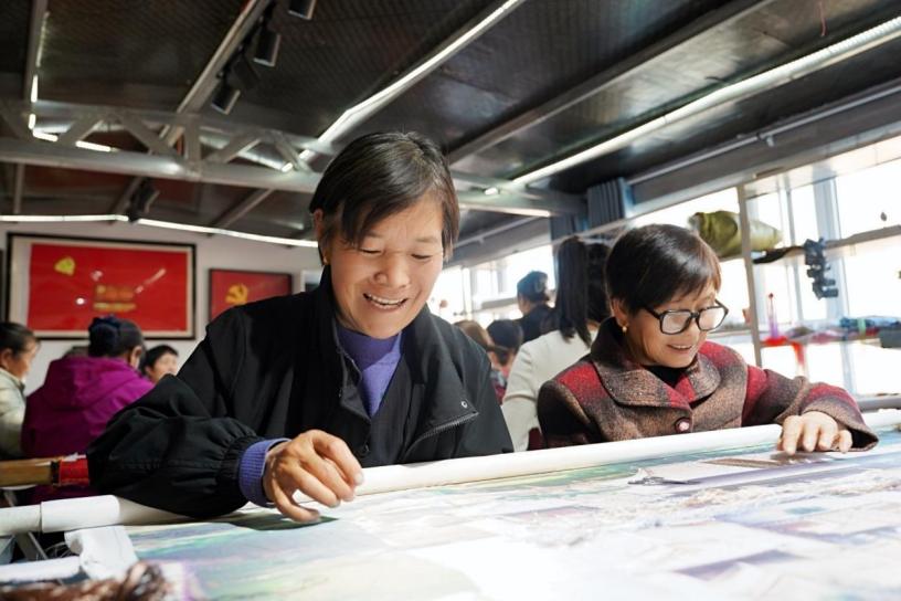 绣娘们正在进行瞿昙寺全景手工刺绣。严静怡摄
