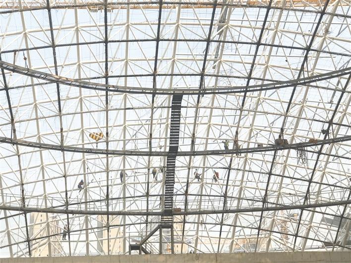 11月12日,陕西奥体中心体育馆的建设者们在进行高空作业。
