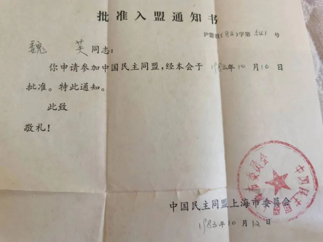 1983年,魏芙由著名演员吴茵介绍,加入了民盟。“吴茵阿姨和父亲一同合作过《乌鸦与麻雀》,两家关系很好。她1956年就入盟了,跟我介绍了很多盟内的情况,并说目前正缺女盟员和年轻盟员,在她的影响下,我也加入了民盟。”
