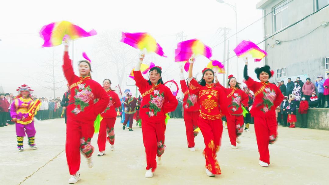 在乳山口镇西南赵家村,村民们早早地聚集在广场上,期待着草埠村秧歌队的到来。随着欢快的锣鼓声响起来,秧歌演出也正式拉开序幕。草埠村秧歌队的青年人,朝气蓬勃,激情四射,花式打法令人眼前一亮,眼花缭乱。在十二岁的小大夫的带领下,秧歌队伍进入村中宽敞地带,以“慢走阵”舞圆场,再以“小盘龙”套路进行彩扇等表演。青春的活力与传统文化的精粹在这一刻完美融合,现场充满了欢声笑语。