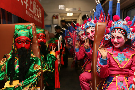 上午8时10分,列车工作人员以民歌演唱和魔术表演节目拉开了活动帷幕。掌声中,社火表演开始,14名“小关公”和“小穆桂英”身着艳丽的社火服饰,画上生动的脸谱,在车厢里神气地游走表演。接着是舞狮表演,两只大红狮摇头摆尾,或直立、或跳跃、或打滚,车厢里传来阵阵掌声和喝彩。