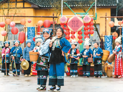 当地村民身穿民族服饰表演节目《苗族盛装》。