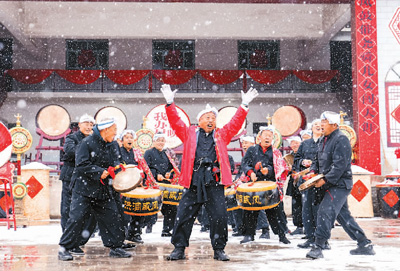 山西洪洞威风锣鼓研究协会队员们正在雪中排练。