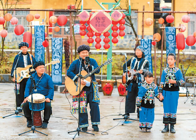 “苗人三蛮”乐队和小朋友正在一起演唱。