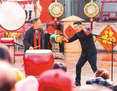张勇(左)和张云剑(右)表演快板与鼓《中国根黄河魂》。