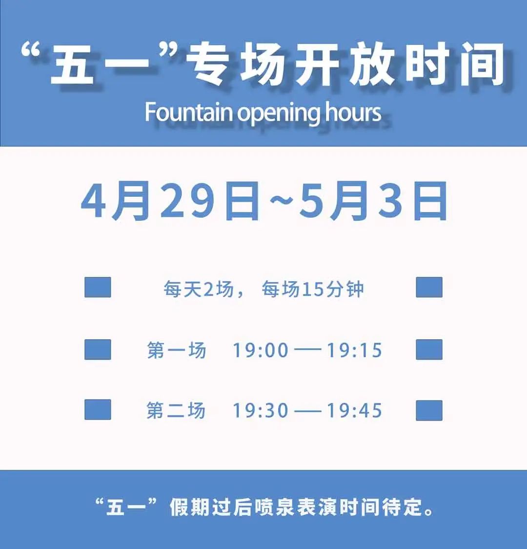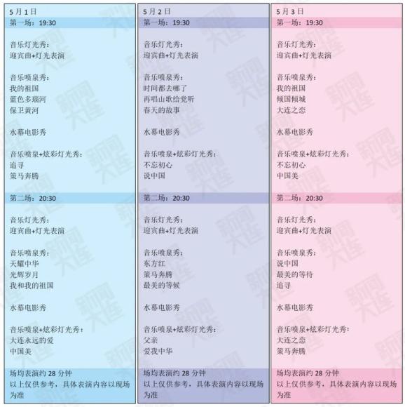 另外,喷泉表演需要良好的天气条件,如遇到风力超过5级(含5级)、降雨等恶劣天气、广场举办重大活动、喷泉设备维护等情况,将实施限制或停止表演,请提前通过“大连东港集团”官方微信了解。