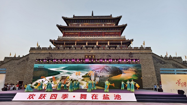 7月26日晚,宁夏吴忠市盐池县长城关脚下热闹非凡,“欢跃四季”2025年沿黄九省(区)优秀广场舞展演在此举行。来自沿黄九省(区)的14支优秀广场舞代表队齐聚一堂,为现场观众带来了一场精彩纷呈的视觉盛宴,甘肃省文化馆丹枫舞蹈团带来的《黄河礼赞》备受瞩目。
