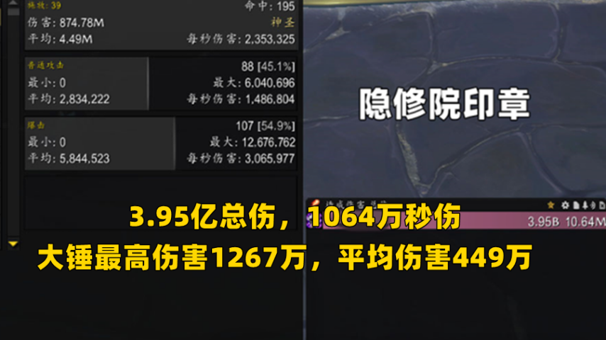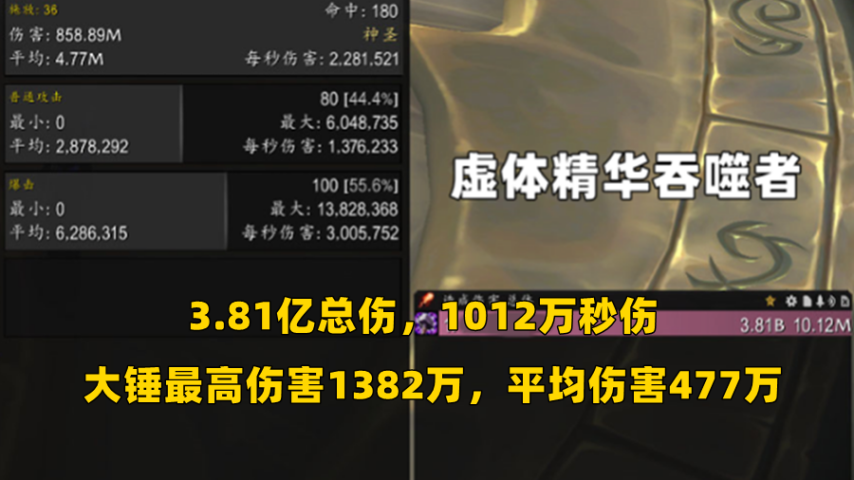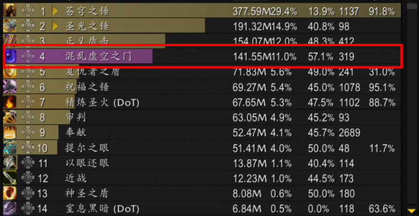 下图是一次11c闸板陋巷的全程伤害。全程打完,混乱虚空之门总伤害为1.41亿排名第四,只比大锤伤害少5000万的样子。