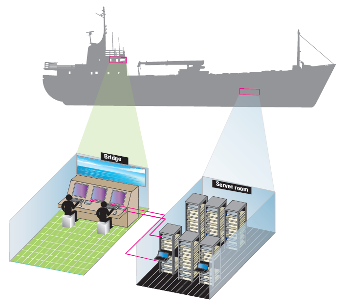 在船舶上,需要集群管理的敏感的电子设备通常比陆地上的数量更多,各种流程必须全天候监控,在海上若出现因天气变化和恶劣的工作环境,空气含盐、空气湿度高、波浪和振动等因素而故障的部件是会造成系统性作业延误并令人担心的。所以其电子设备通常安装在下层甲板中一个有门禁保护的数据机房这种非专业人士无法进入的地方,远离有极大可能暴露至风雪海水等元素的地方,保证更高水平的养护和管理,延长昂贵的设备的使用寿命。