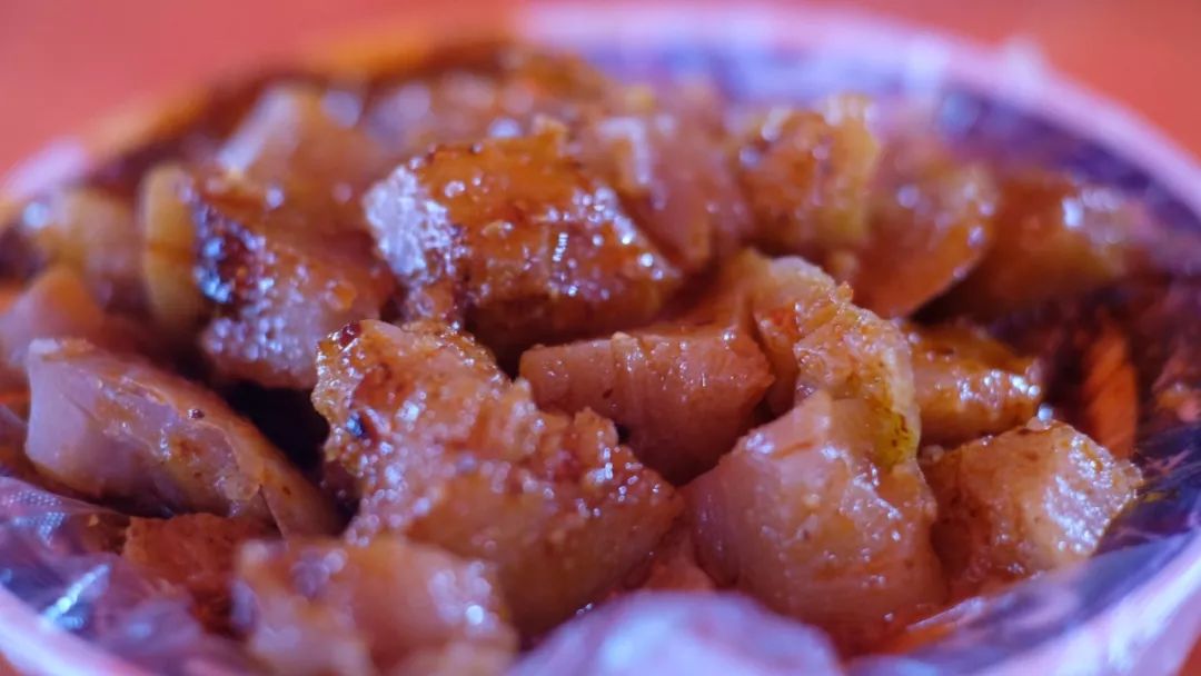 刚出锅的时候像个Q弹的大布丁,吃的时候用刀切下一小块,然后直接上手~捏碎。