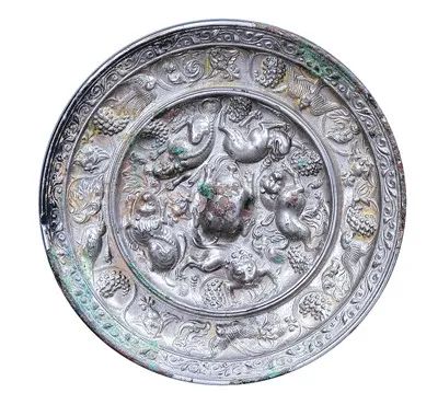 ▲ 天水市博物馆馆藏珍品——唐代瑞兽葡萄纹铜镜,瑞兽纹和葡萄纹都传递着美好的寓意,体现了中西方文化的交融。