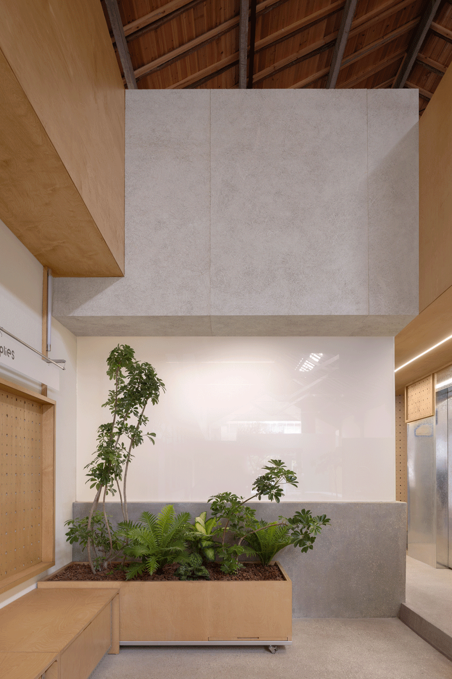 Rough washed stone is used for the indoor bar counter, seating, and flooring, creating a simple, natural aesthetic. The gravel concrete flooring and gray washed walls complement each other, enhancing the outdoor feel of the space. The rough textures provide a non-slip surface for pets, while also offering the durability and stain resistance akin to outdoor natural materials. The retail display walls and movable furniture system are constructed using a collage of marine plywood panels, creating a warm and inviting atmosphere that complements the wooden ceiling. The clever selection of these materials, along with their natural weathering over time, will further enhance the building’s texture.