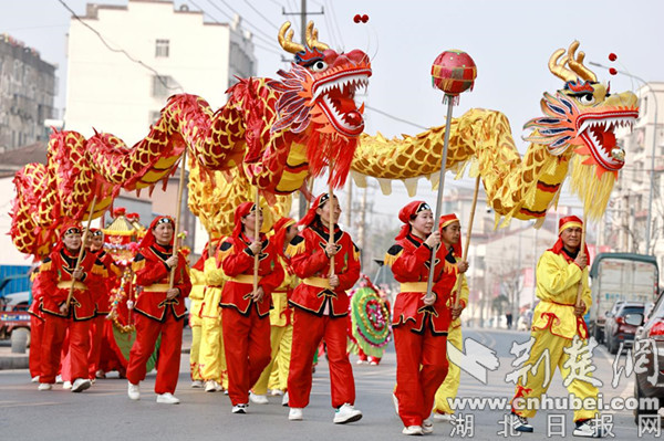 荆楚网(湖北日报网)讯(通讯员 左杨)锣鼓喧天、双龙飞舞、河蚌吐珠......2月18日上午,由牌楼镇本土民间艺人、文艺骨干组成的舞龙、采莲船、十班家什、蚌壳精、大头娃娃、唐僧师徒、歌舞、曲艺8支传统民俗表演队,身着各色服饰,手持特色表演道具,从镇新时代文明实践所出发,沿着集镇大道,一路踩街一路送祝福。沿街观看的人群不断欢呼鼓掌,洋溢着幸福的笑脸,居民们纷纷用镜头记录下精彩瞬间,留下美好的回忆。