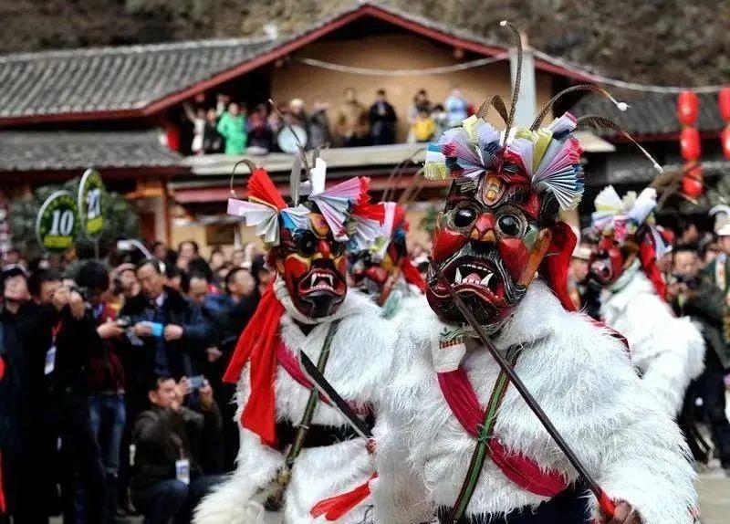 在文县铁楼乡,白马藏族用跳“池哥昼”来迎接新年,各村有自己规定的时间和特定的表演人员,正月十三从麦贡山开始,小村寨跳一天,大村寨跳两天,由东向西顺接表演,直到正月十七草坡山跳完,白马人的“池哥昼”才算结束。