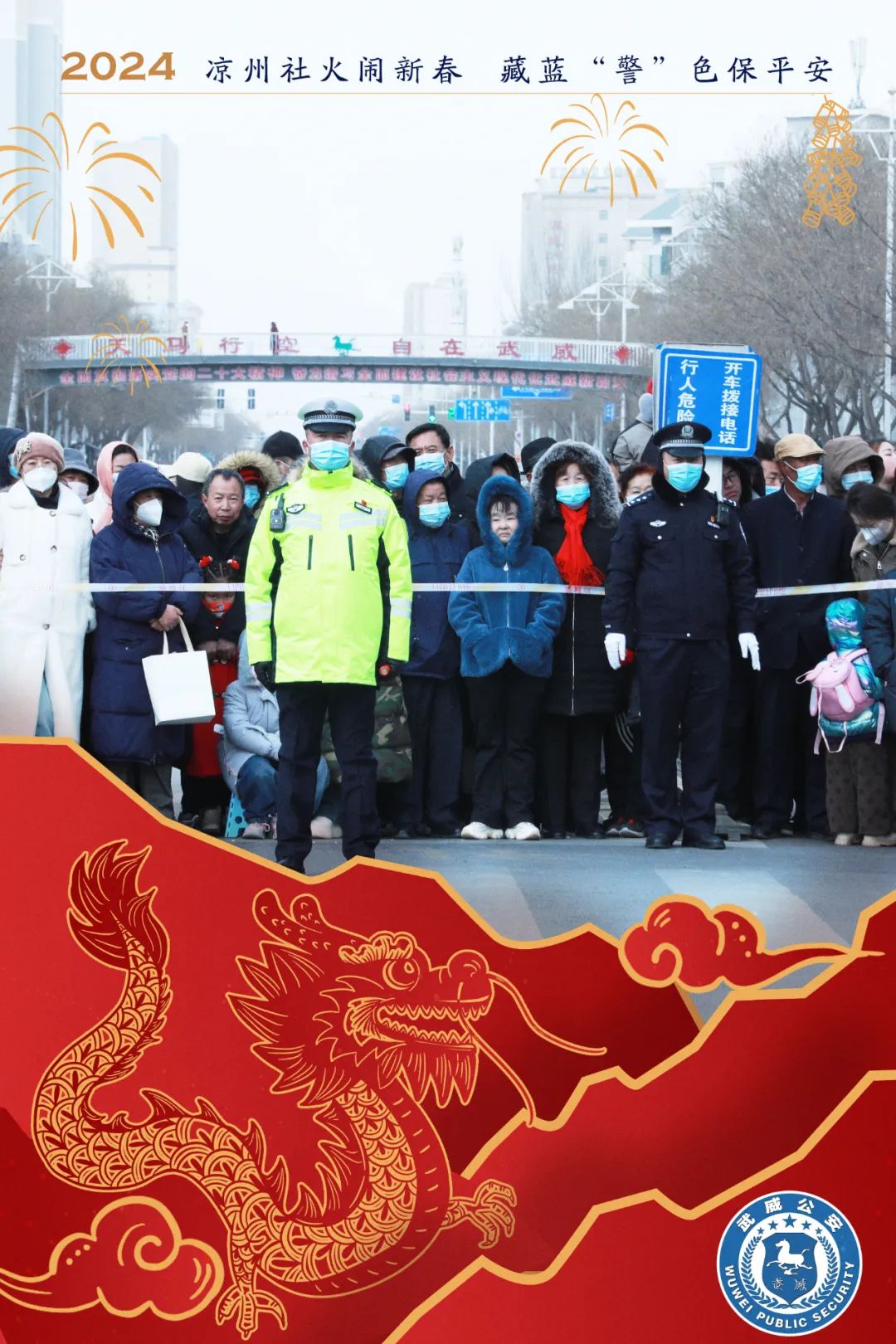 龙腾狮跃贺新春,欢天喜地过大年。踩高跷、舞龙狮……作为传统文化的民间艺术瑰宝,社火表演让春节充满了节日特有的喜庆氛围。2月18日(农历正月初九)上午,武威市凉州区2024年春节城乡社火展演活动在凉州城区举行,迎来四邻八乡群众围观。为确保社火展演安全有序,活动顺利进行,武威市区公安机关牢固树立“安全无小事”的理念,超前谋划,周密部署,各警种部门上下贯通、横向联系、整体联动,全体参战民辅警提前上岗,恪尽职守,积极落实各项安保任务,全力护航社火展演。