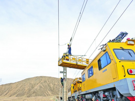 职工利用接触网作业车平台进行故障消缺。西宁供电段供图