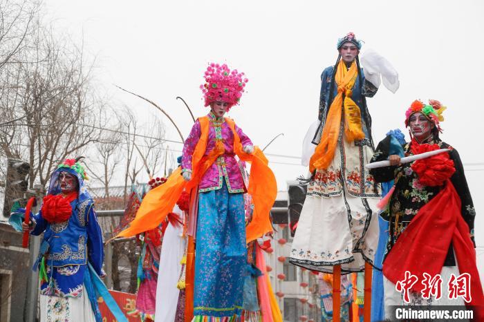 (新春走基层)青海高跷之乡闹社火 雪中高跷精彩上演