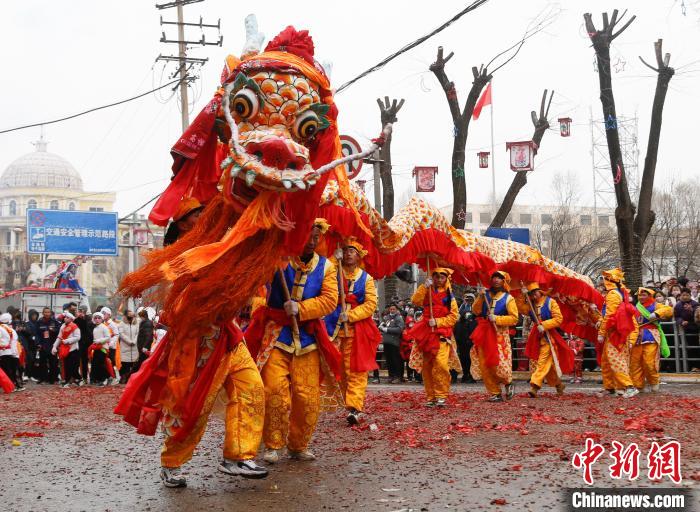 图为青海省西宁市湟中区社火巡演中的舞龙表演。  马铭言 摄