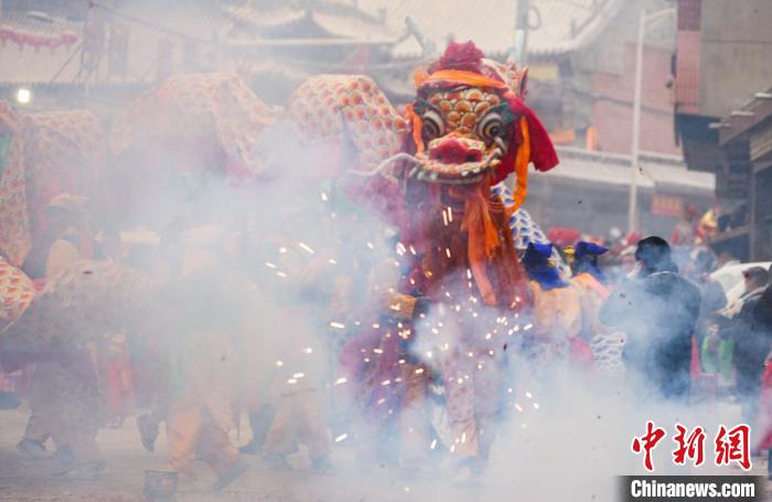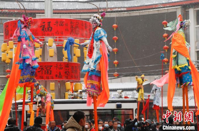 2月21日,中国农历正月十二,青海省西宁市湟中区进行社火巡演,伴随锣鼓鞭炮声,舞龙、舞狮、“大身子”、老秧歌、高跷等节目精彩上演,“杨六郎”“七仙女”“孙悟空”等70名高跷演员和500多名社火演员在降雪天气中为民众祝福祈愿。