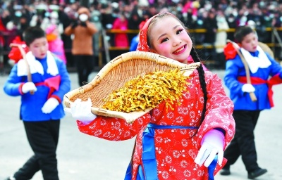 在陇县元宵节社火巡游活动上,少儿社火队员在扭秧歌。新华社记者 刘潇 摄