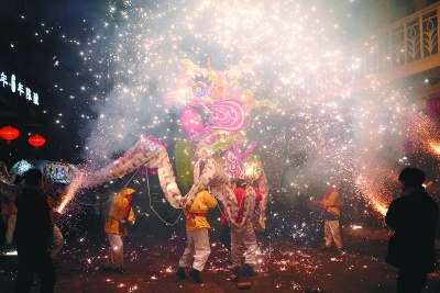 旬阳市神河懒龙舞龙队伍在表演烧灯。新华社记者 邵瑞 摄