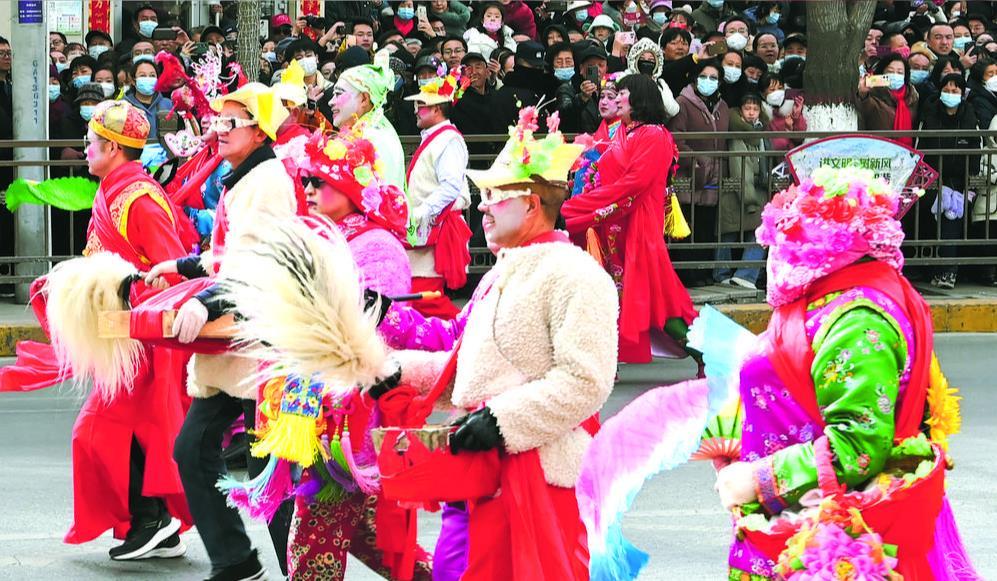 浓妆艳抹的胖婆娘、摇曳起伏的旱船、憨态可掬的大头娃娃……社火队伍浩浩荡荡,从西门十字出发,沿西大街、东大街、大众街表演,全长3公里,所到之处,喜庆洋溢。龙灯、抬花轿、太平鼓……一连串异彩纷呈的表演令人目不暇接,吸引两边围观群众拍手称赞,纷纷举起手机记录精彩瞬间。