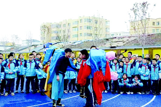 “哇,木人摔跤真是太精彩啦,我也要学习木人摔跤表演……”3月1日下午,清水县轩辕小学操场上,木人摔跤表演赢得师生的阵阵喝彩。在该校定期开展的少年宫活动中,缑红斌和他的徒弟高宏正在指导学生进行木人摔跤表演。只见穿着行头的学生在两位传承人指导下,跟着音乐一会儿向前、一会儿向后、一会儿又突然来个转身,好不热闹。围观的学生更是跃跃欲试,争着想要一试身手。