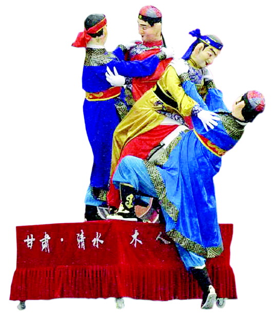 清水木人摔跤的历史渊源与其他地区的“二鬼摔跤”“二喜摔跤”极为相似,可以说是古代“抱跤人”的流传分支,其功能基本相同。逢年过节,清水县一些民间艺人用桃木雕成两个木人头部装在固定的木架上,身着古代武士服饰,木人两手相抱,呈摔跤姿势,然后套在真人身上。真人两手装成一个木人的两脚,两脚装成另一个木人的两腿,表演时模仿摔跤动作,以推、勾、倒、翻等为基本动作,按照民间鼓乐曲,或藏或隐,或进或退,参差映衬,其鼓点乐曲有“水底鱼”“浪头马腿”等。