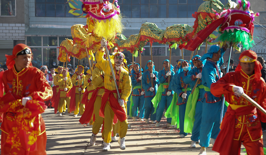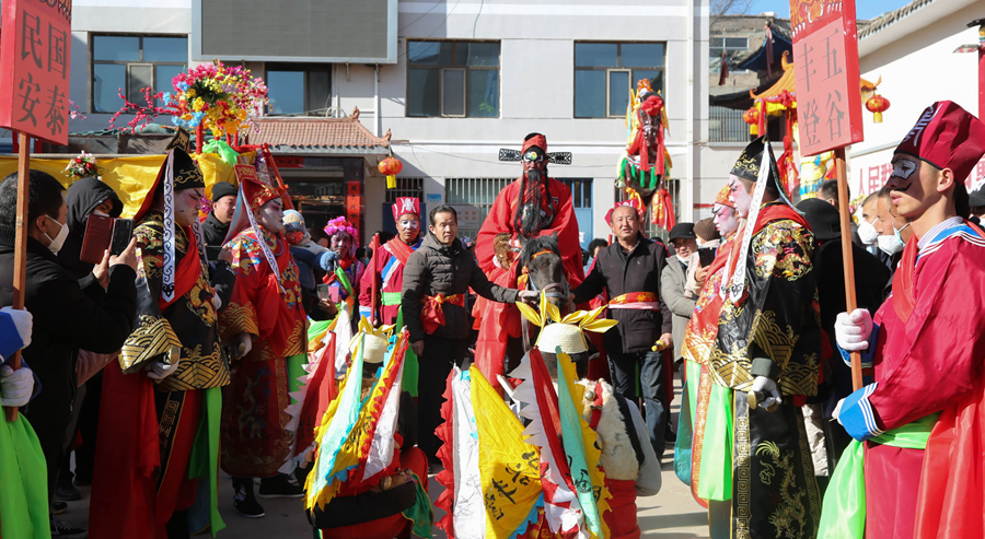 社火作为悠久民间传统活动,镌刻着中国五千年来的文化符号。一场文化与艺术完美融合的视觉盛宴吸引许多路人驻足,扭秧歌,踩高跷等表演或铿锵有力,或滑稽可笑。不仅演出了节目的喜庆,演出了人们的欢乐与幸福,也表达了人们对美好生活的向往和追求。(摄影:王子腾)