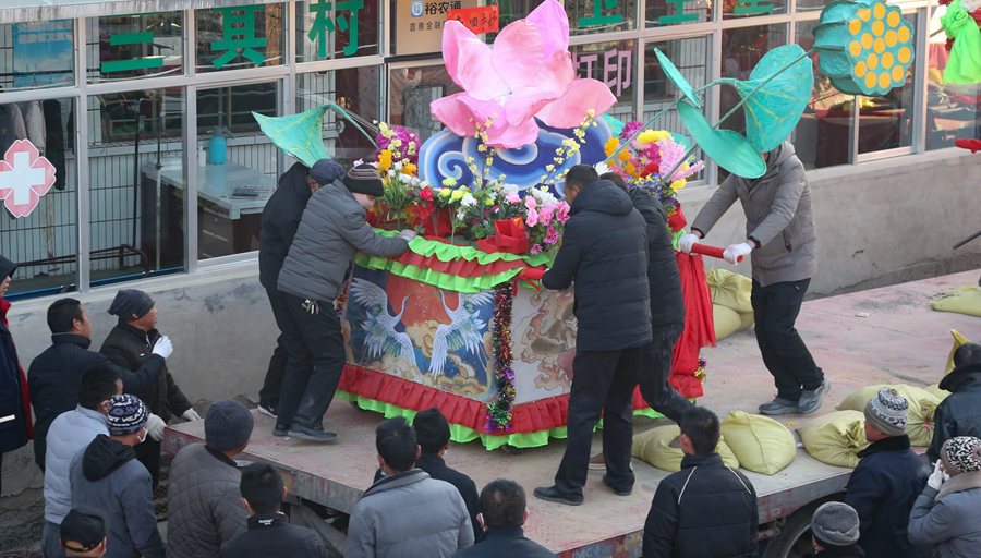 三其村口,村民们齐心协力和社火队员一起搭起舞台和高架、帮助社火队员穿上戏服,脸上的喜悦难以掩饰。