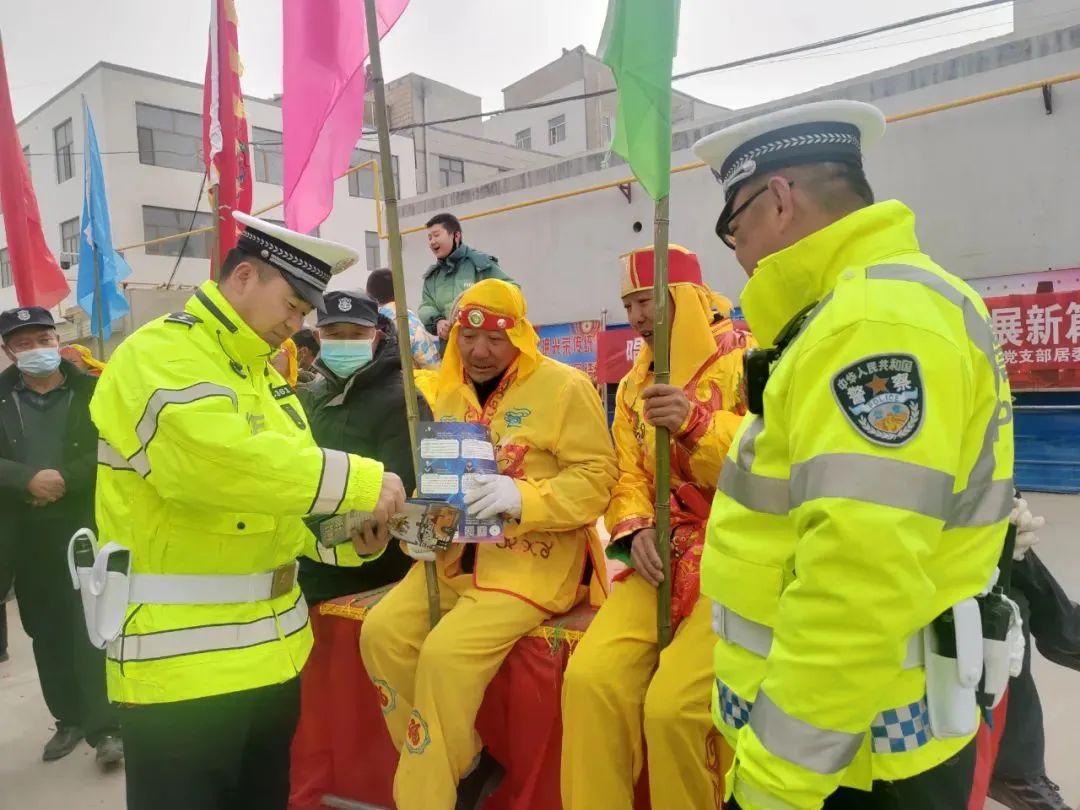 锣鼓喧天、龙腾狮舞,热闹的社火队在辖区农村表演,为营造欢乐平安,喜庆祥和的节日氛围,市公安局交警支队在做好内外围交通保畅的同时,走进社火表演现场、走进人群开展交通安全宣传活动。