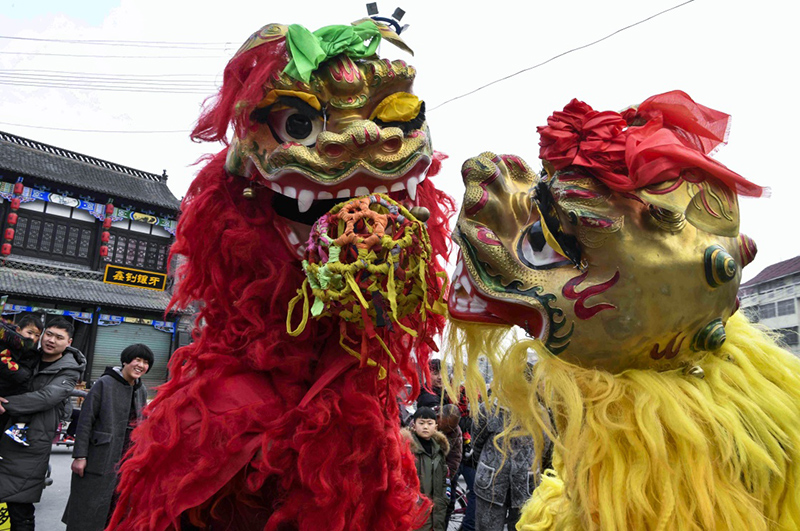 2月17日,民间艺人在安徽亳州北关历史街区表演舞狮。
