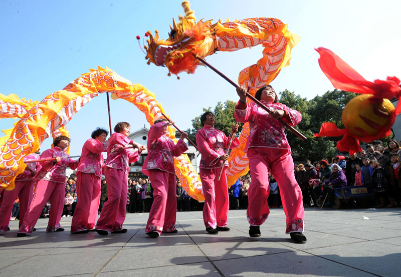 2月17日,在江苏苏州吴江同里古镇,女子舞龙队为游客表演舞龙。