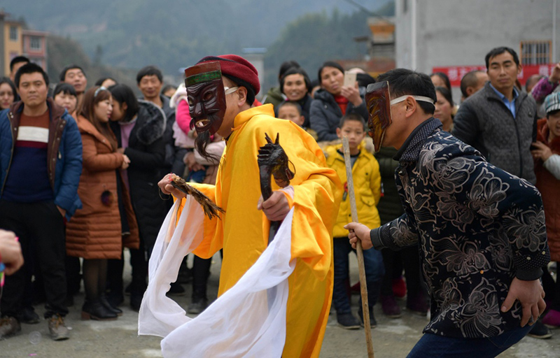 2月16日,湖北省利川市毛坝镇新河村村民在表演傩戏。