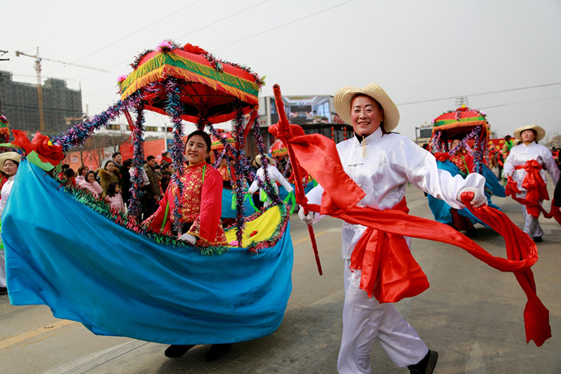 2月16日,在江苏省连云港市赣榆老街,民俗表演队在表演划旱船。