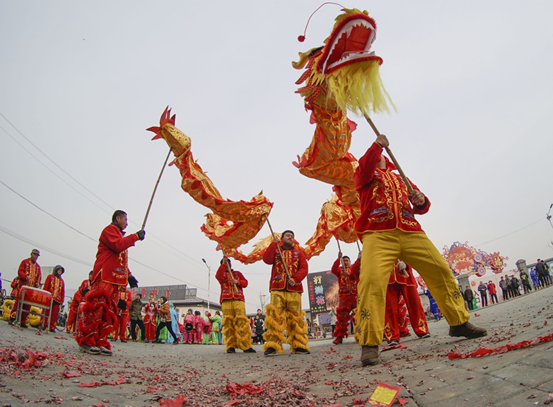 2月17日,河北遵化山里各庄村农民花会队在村广场表演舞龙。