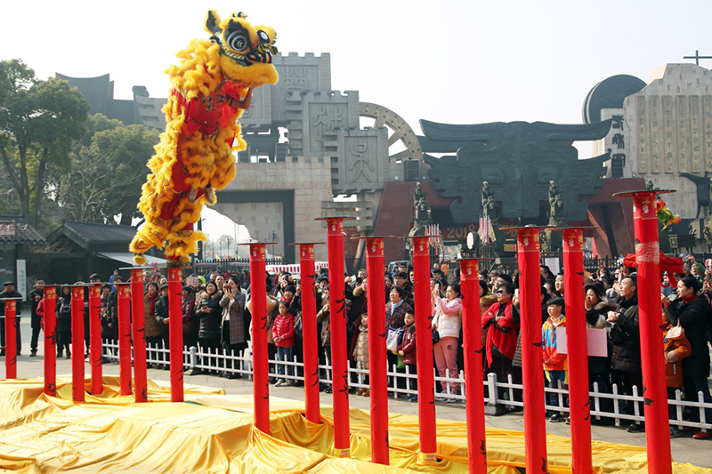 2月17日,游客在江苏常州春秋淹城观看南狮梅花桩民俗表演。