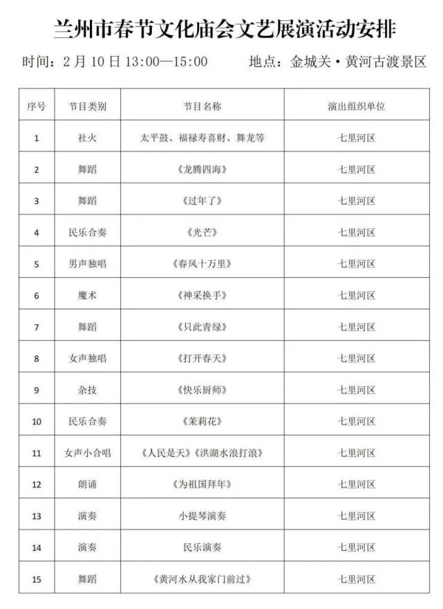 3.什川镇社火队:上午10:20从县委党校出发,沿健康路、新泰十字、检察院十字、保险公司十字、兰泉路进行表演。上午11:00在县委大院集中表演,表演结束后沿北辰路返回县委党校。