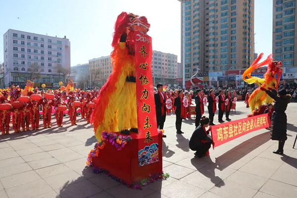 县社区事务中心秧歌队刚刚代表我县参加完“鸡西市2024年元宵节花车巡游秧歌展演活动”,就立即赶回来为全县人民送上精彩演出。表演以身着红彤彤“小龙人”服装的小朋友开场,彩扇与大鼓表演一唱一和,挥出了鸡东“全市站排头、全省创一流、全国争上游”的奋斗姿态,敲出了以坚如磐石的信心、只争朝夕的劲头、坚韧不拔的毅力,全力推动实施“五强四新”战略的美好愿景。舞龙舞狮更是舞出了鸡东人民锚定“鸡东高质量发展、可持续振兴”美好蓝图,加快社会主义现代化新鸡东建设中贡献全部智慧和力量的决心。